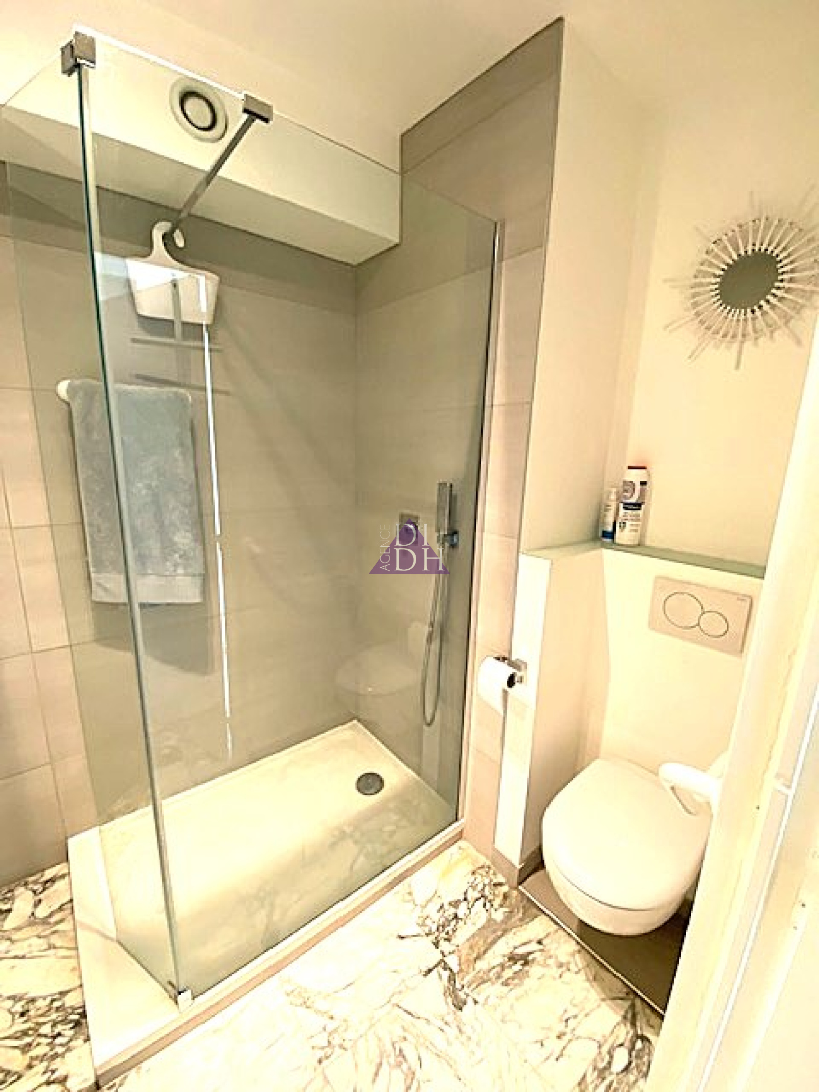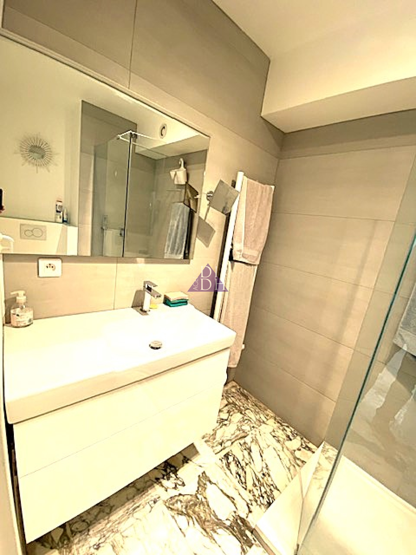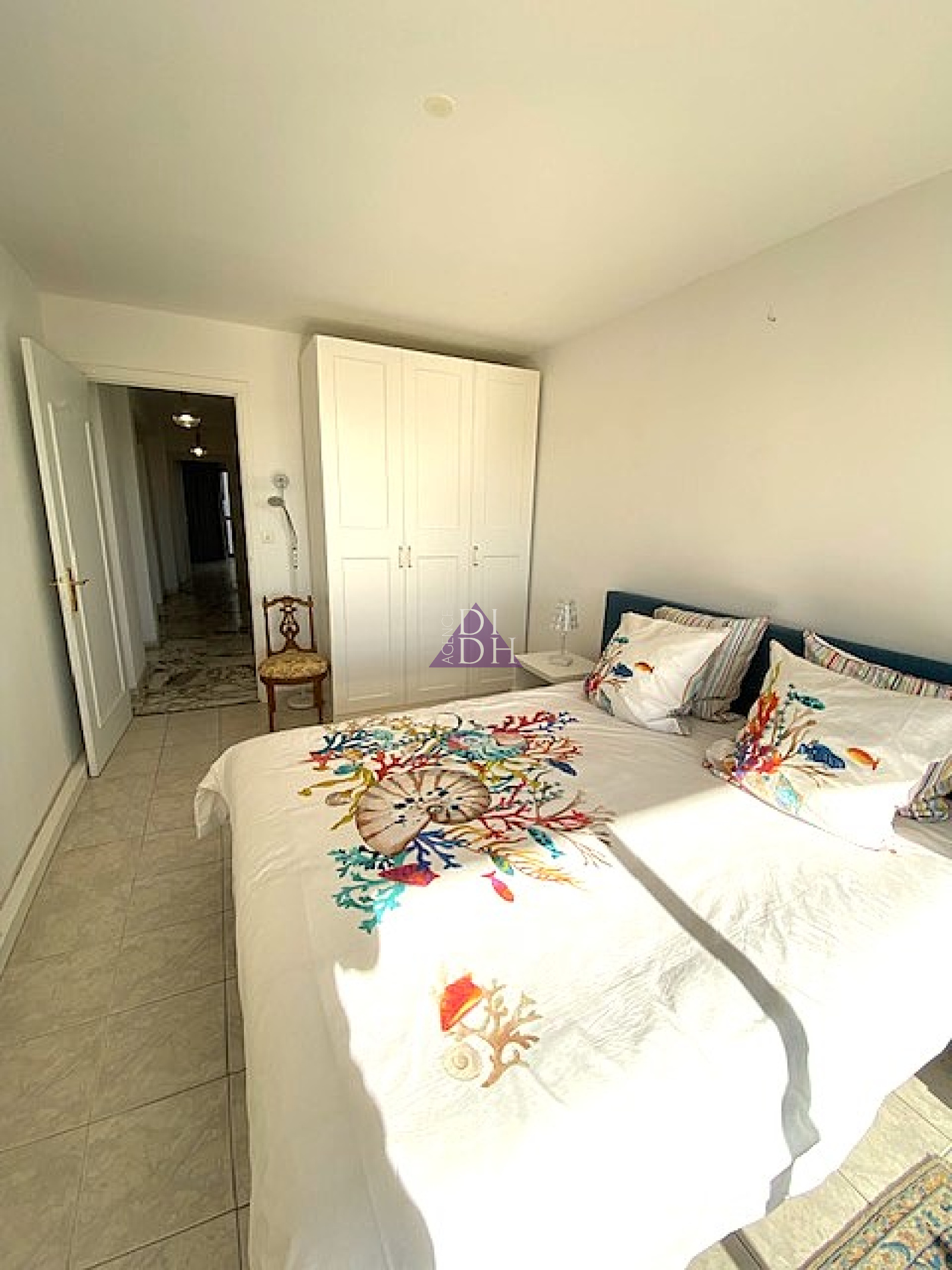 Equipements : Climatisation réversible dans le séjour et les 2 chambres, cuisine aménagée et équipée, placards, plaque vitrocéramique, hotte, micro onde, lave vaisselle, réfrigérateur-congélateur,lave linge, seche linge, stores électriques et stores bannes électriques.Fibre.Télévision.Porte blindée.