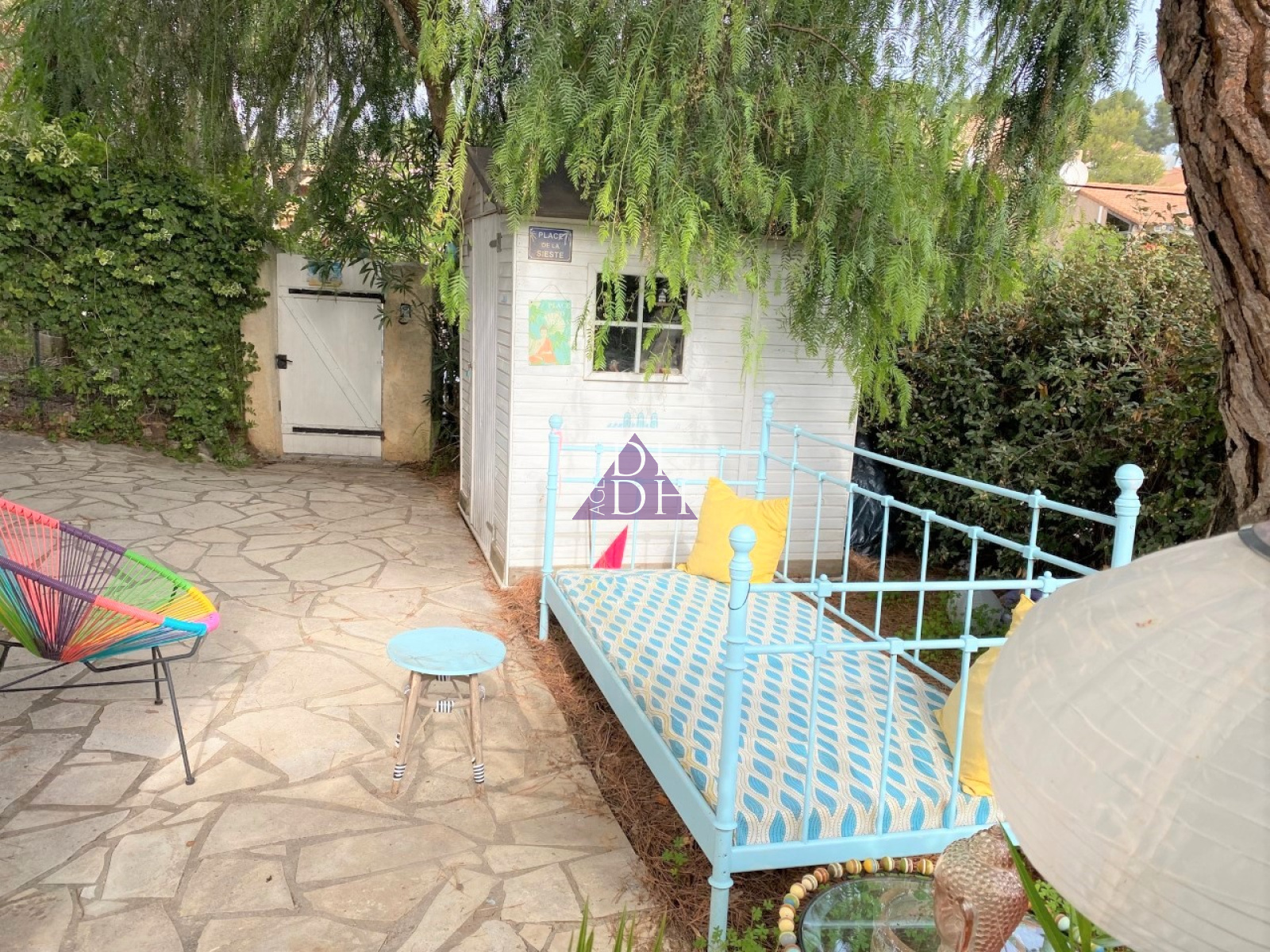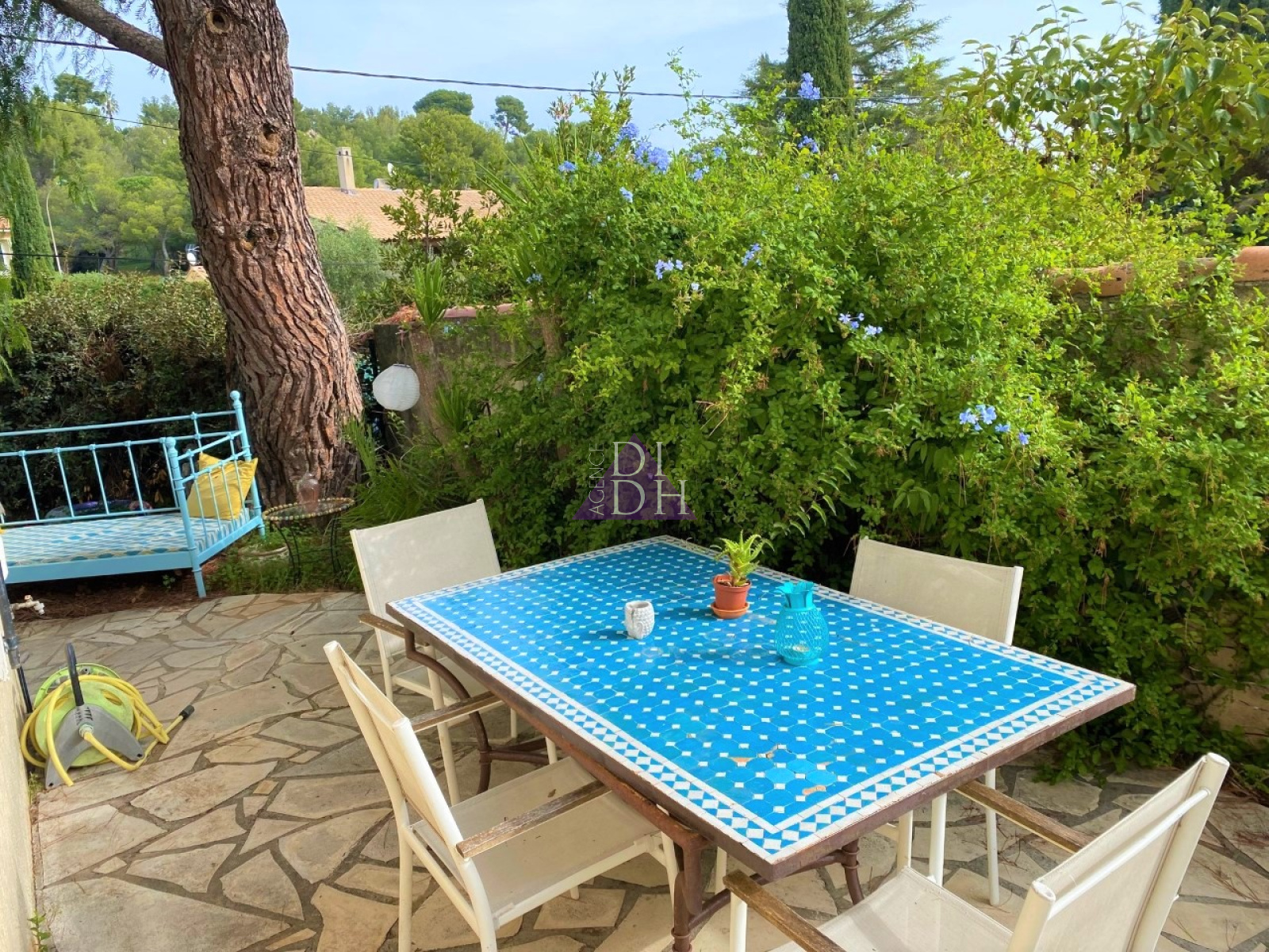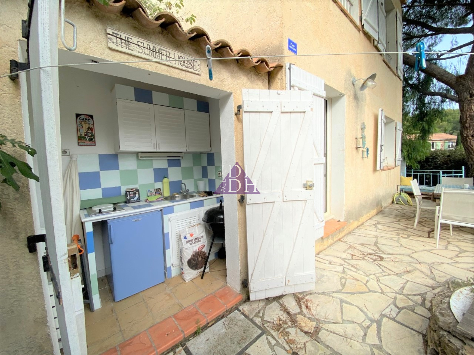 Le jardin privatif de 130m² à jouissance exclusive accueille de belles essences méditerrannéennes, ainsi q'une cuisine d'été.