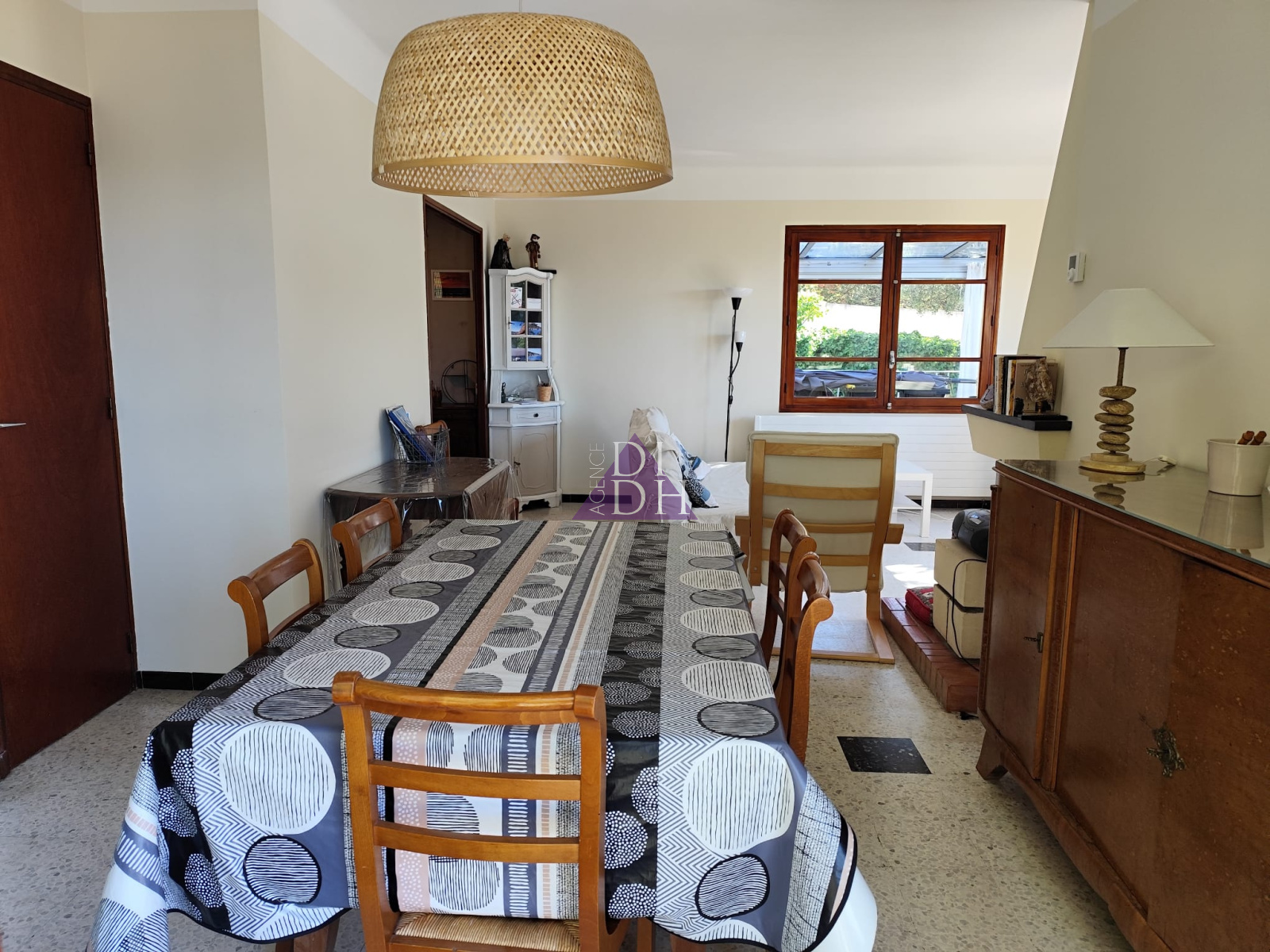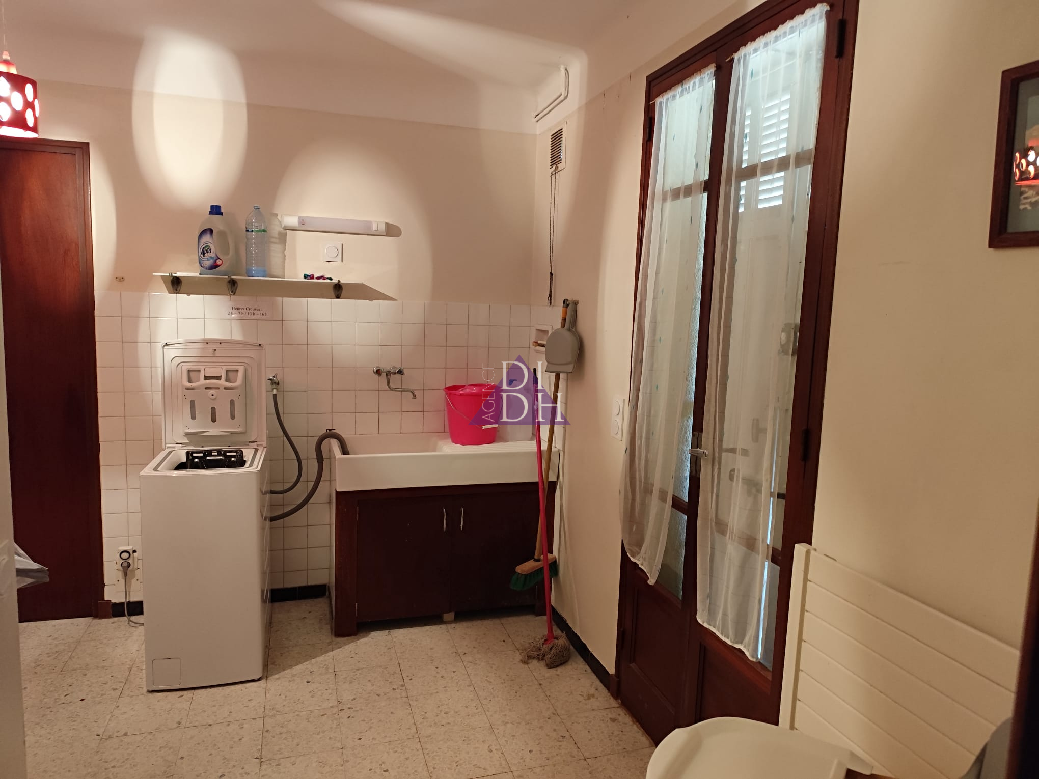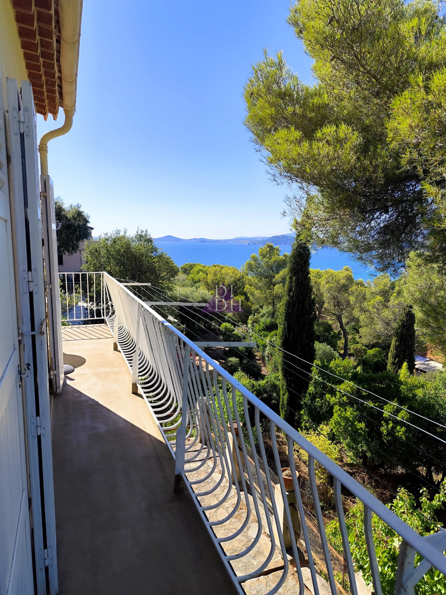 Sur deux niveaux, elle se compose au rez-de chaussée d' une entrée accueillante avec poêle à bois, d'un séjour double lumineux donnant sur un balcon avec vue mer et colline, d'une cuisine séparée, d'un dégagement avec rangements, d'une salle de bains et WC indépendant. Une véranda de 10m2 offre une surface supplémentaire non négligable ainsi qu' une grande terrasse de 33m2 exposée sud.