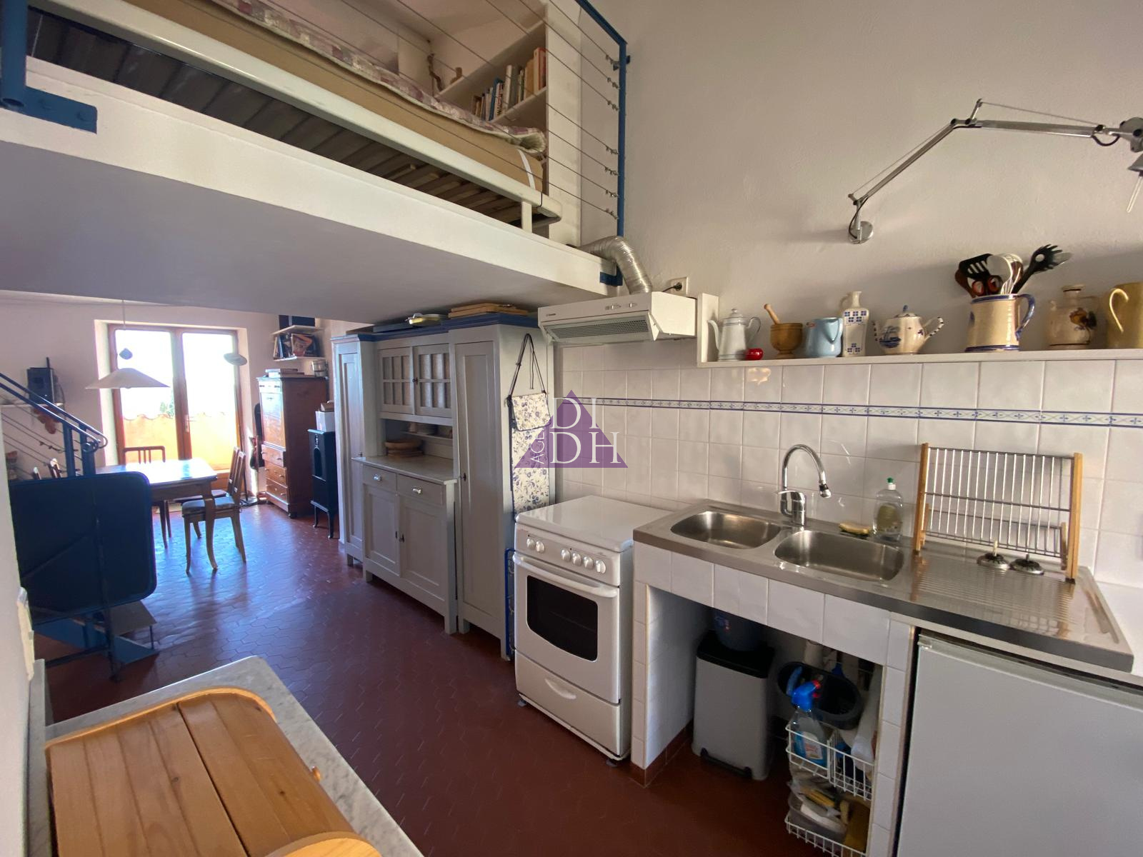 - aux premier et second niveaux, l'habitation principale, avec deux chambres, un bureau, un séjour traversant avec mezzanine ouvrant sur une terrasse tropézienne (7m²).